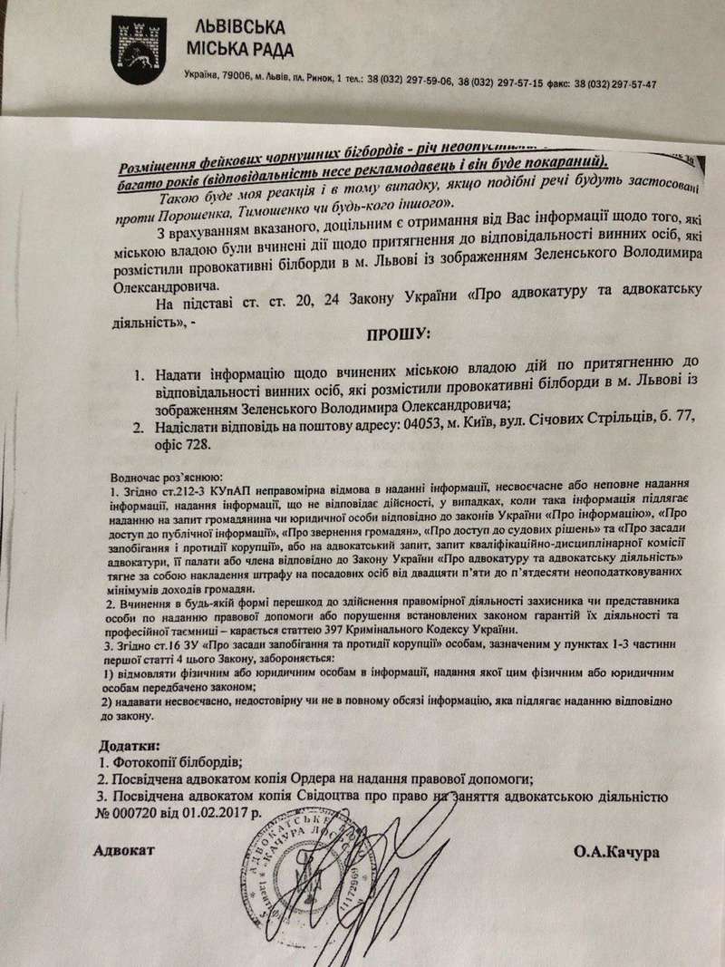 «Вы, как лидер политической партии «Объединение «Самопомощь» и городской голова Львова, раскритиковали провокационные билборды с изображением Зеленского. В частности, на своей странице в социальной сети Facebookподчеркнули, что размещение фейковых чернушных билбордов – вещь недопустимая, и пообещали, что лица, которые разместили билборды будут наказаны», –апеллирует к Садовому в своем письме собственник адвокатского бюро Kachura Lawyers и адвокат кандидата в президенты Владимира Зеленского.