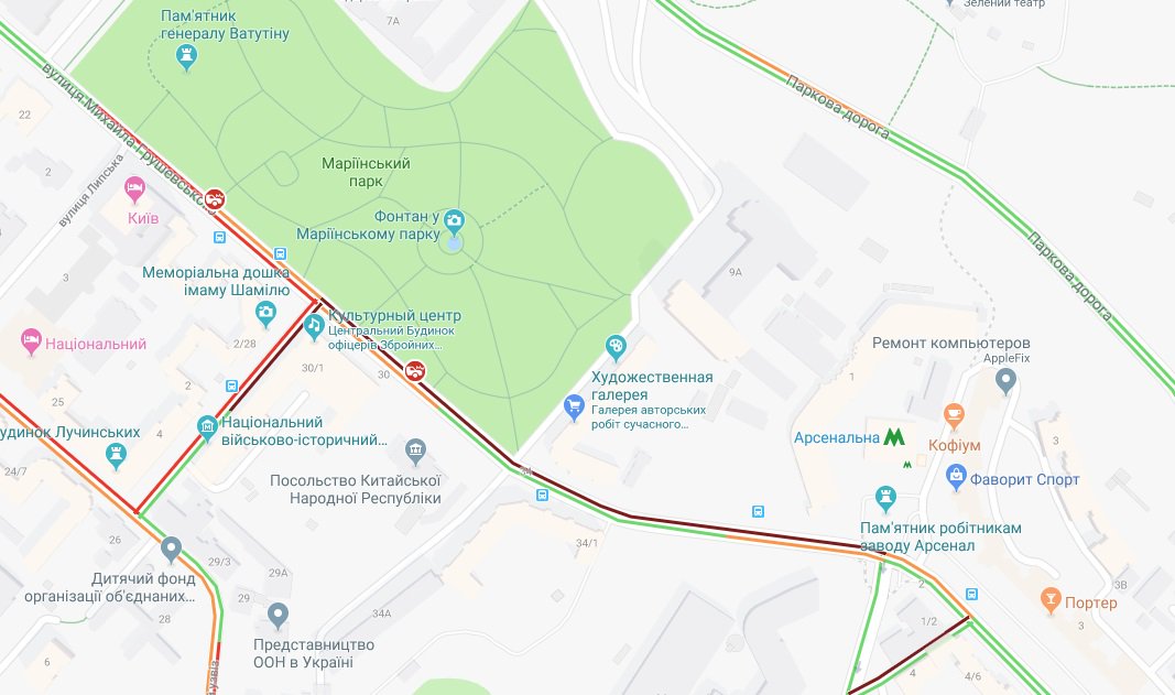 Согласно данным Google Maps, движение транспорта по ул. Грушевского до сих пор осложнено.