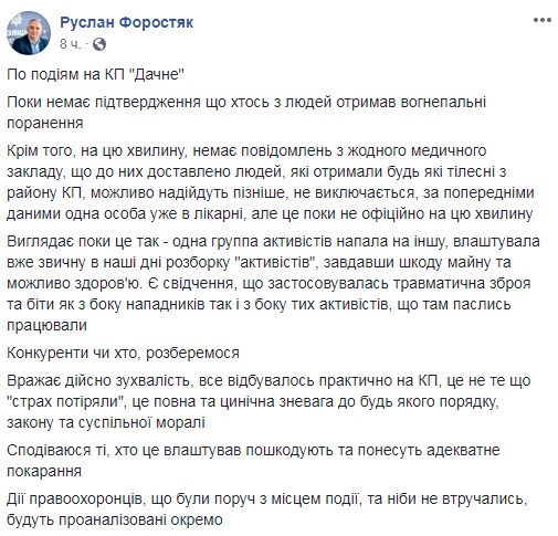 По его словам, две группы активистов устроили разборки со стрельбой. При них использовались травматическое оружие и биты. Он отметил, что одна из групп "стоят рядом с Укртрансбезопасностью и кормятся за их деньги", а вторые нападали на них.