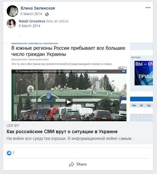 Отметим, что станица Зеленской содержит множество публикаций за 2014 год, которые не говорят о ее пророссийской позиции. Она публиковала материалы разоблачающие пропаганду РФ и призывы к Путину не трогать Украину.