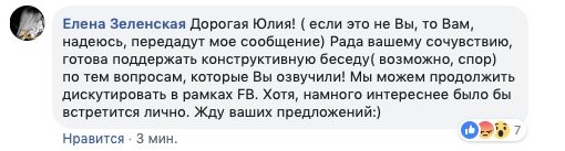 «Дорогая Юлия! (если это не Вы, то Вам, надеюсь, передадут мое сообщение) Рада вашему сочувствию, готова поддержать конструктивную беседу (возможно, спор) по тем вопросам, которые Вы озвучили! Мы можем продолжить дискутировать в рамках FB. Хотя, намного интереснее было бы встретится лично. Жду ваших предложений:)», — написала она.