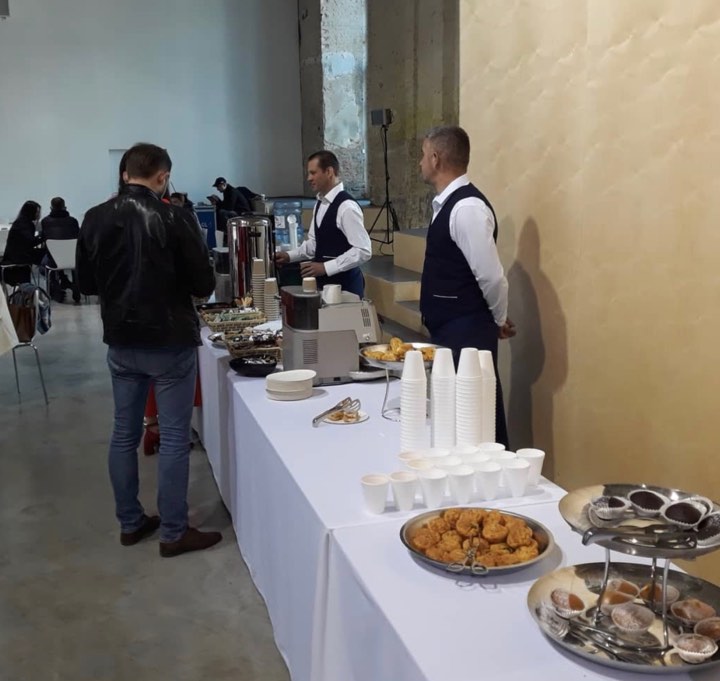 «Штаб Порошенко уже работает в Мыстецьком арсенале. Каких-либо различий по сравнению с первым туром нет», - сообщил спецкор Юрий Смирнов. Он также рассказал, что место и еда не поменялись. Различие только в том, что стулья отставили от сцены. Раз в тридцать минут должны проходить выступления от общественности. Также Смирнов решил пообедать в штабе Порошенко и даже приуныл. Как выяснилось, еда не совсем та же: «Еды меньше, чем было в первом туре. Только кексы. В прошлый раз уже с 12:00 были пироги, а теперь — только кофе и кексы», - рассказал журналист.