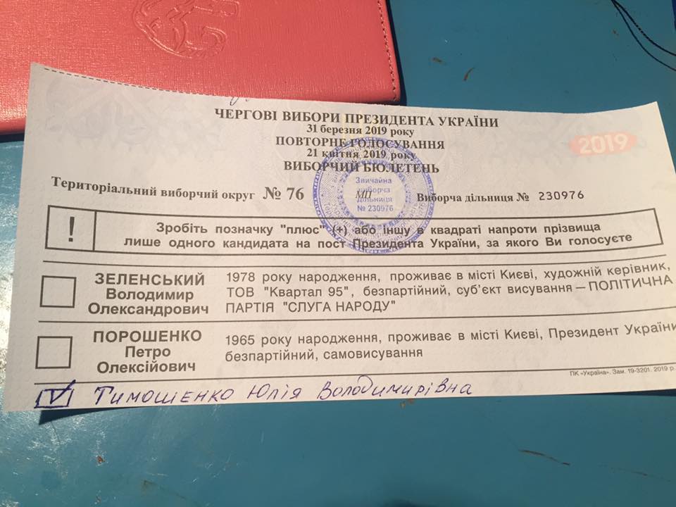 Инцидент произошел в воскресенье, 21 апреля, на 76 округе. Один из избирателей в списке в бюллетене не нашел достойной кандидатуры и дописал «своего кандидата» Юлию Тимошенко.