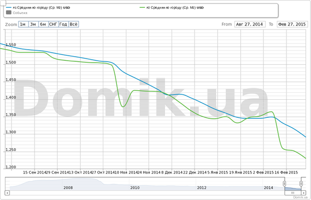 Графики изменения средних цен предложений (как в гривнах, так и в долларах) по всем сегментам рынка представлены http://domik.ua/nedvizhimost/dinamika-cen.html . При их анализе необходимо учитывать, что средние цены в значительной степени зависят от изменения состава предложения (особенно, на малых выборках).