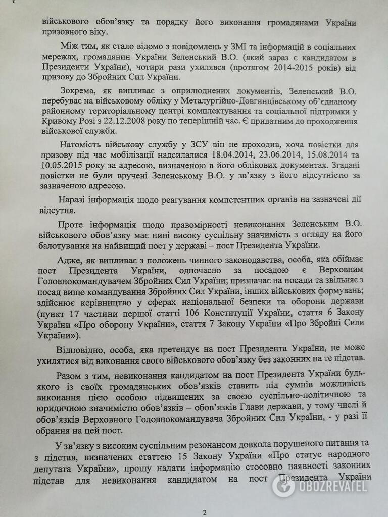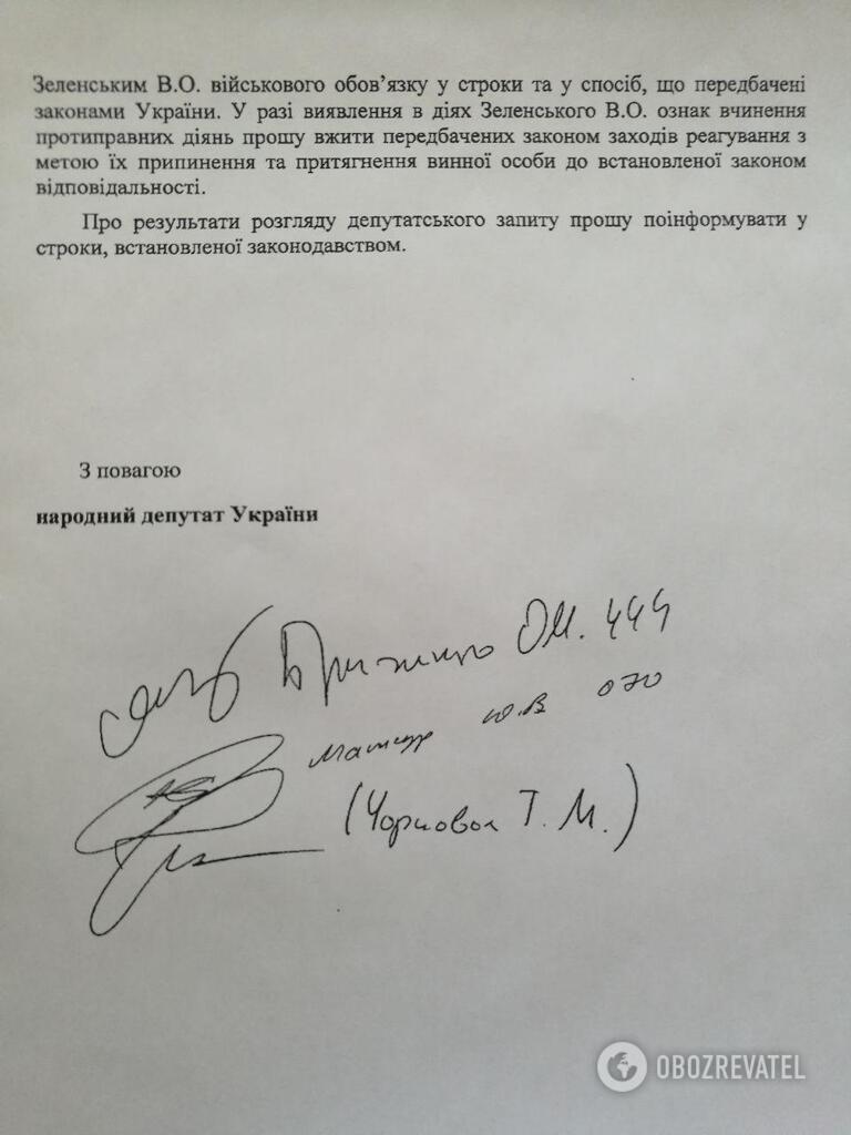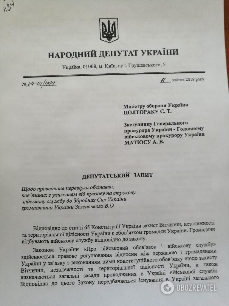 "Информация относительно правомерности невыполнения Зеленским военного долга имеет высокое общественное значение из-за баллотирования его на самый высокий пост в государстве – пост президента", – заявляется в депутатском запросе.
