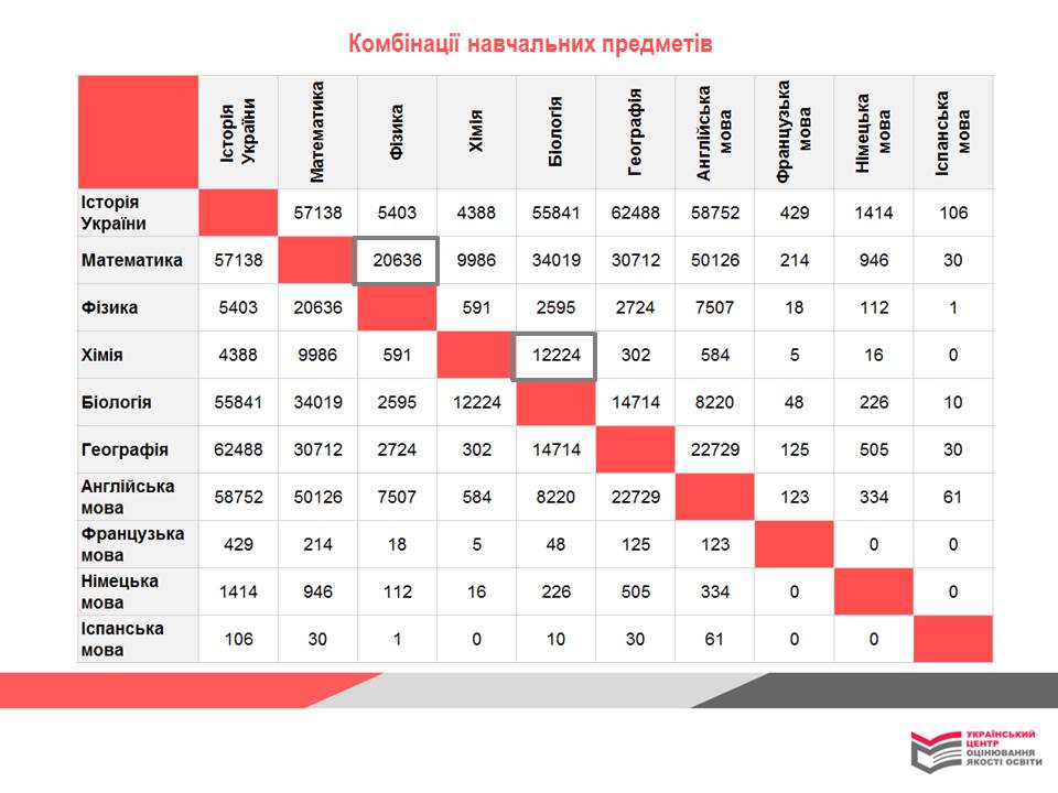 Самыми популярными предметами снова стали украинский язык и литература, на которые зарегистрировались 320 736 человек. Далее следуют история Украины – более 232 тысяч зарегистрированных и математика – более 146 тысяч желающих. Значительное количество заявлений было подано на биологию и географию – более 81 и 80 тысяч соответственно.