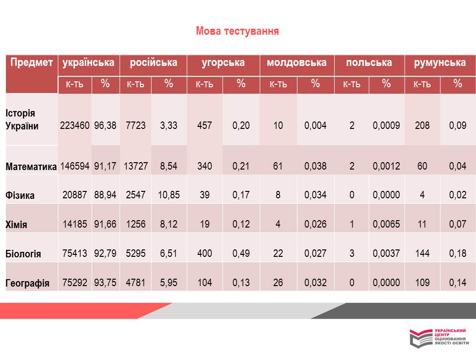 Подавляющее большинство тестов будут сдаваться на украинском языке. Лишь 3,62% тестируемых будут сдавать историю Украины на одном из языков национальных меньшинств; 8,82% – математику; 11,06% – физику; 8,35% – химию; 7,22% – биологию; 6,25% – географию.