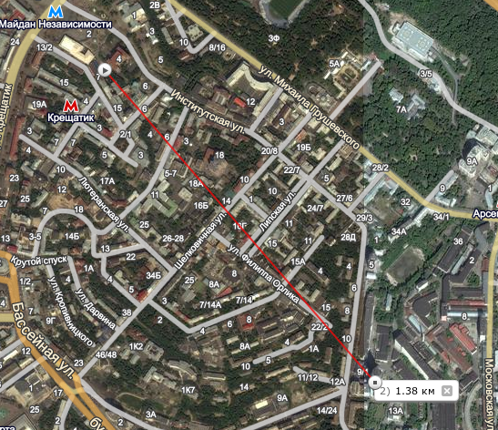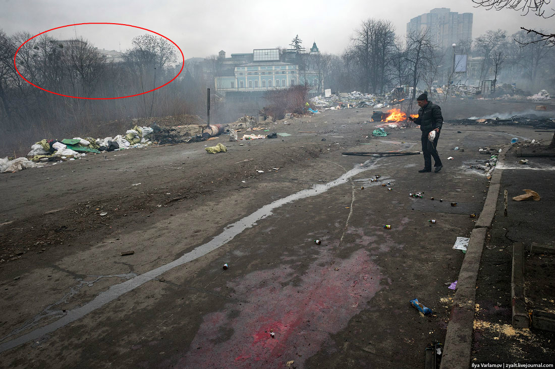 скорее всего, стрелок сидел на высотке-новострое на Кловском спуске, 7; по дистанции примерно подходит “монстр” на Грушевского, 9А, но оттуда Институтская, 4А, не должна просматриваться из-за гостиницы “Украина”
