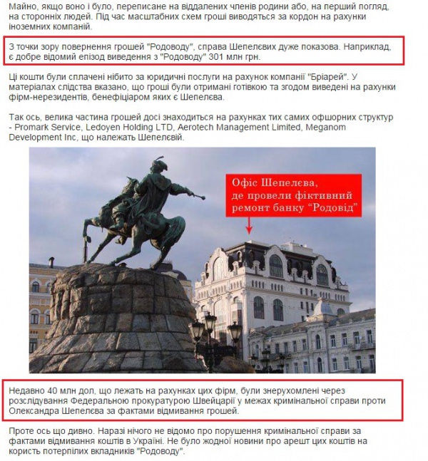 Більш того, в інтерв’ю "Економічній правді" екс-управляючий "Родовіду" Сергій Щербина, який три роки просидів в ізоляторі, назвав Шепелєва організатором розкрадань у фінансовій установі.