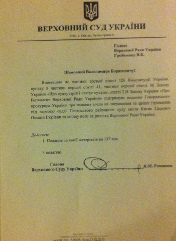 Згоду на арешт суддів Вовка, Кицюка та Царевич підписав голова ВСУ