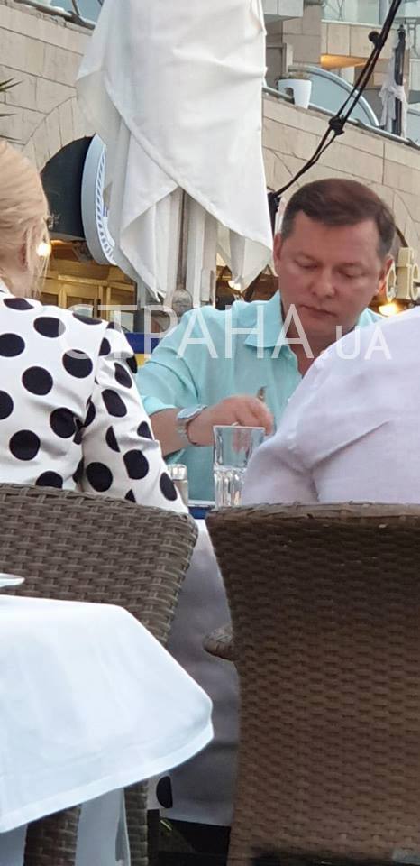 Олега Ляшко удалось запечатлеть корреспонденту "Страны". Радикал ужинал в компании двух человек: мужчины и женщины. Судя по фигуре и прическе спутника Ляшко, им мог быть его кум и соратник Юрий Сухин, который часто путешествует с радикалом по всему миру.