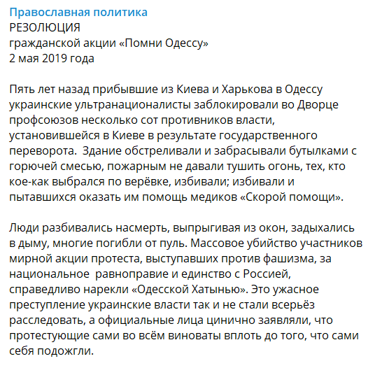 Нелепым заявлением о событиях 2 мая 2014 года отличился он в своем Telegram-канале "Православная политика".