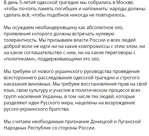 Помимо этого, Чаплин опубликовал так называемую "резолюцию" гражданской акции "Помни Одессу" в Москве, в которой в очередной раз рассказал о "зверствах украинской власти".