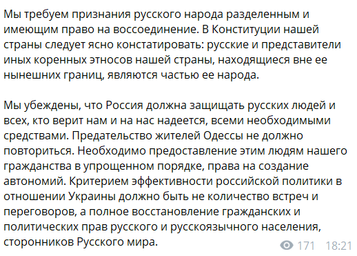 полное восстановление гражданских и политических прав русского и русскоязычного населения, сторонников русского мира в Украине.