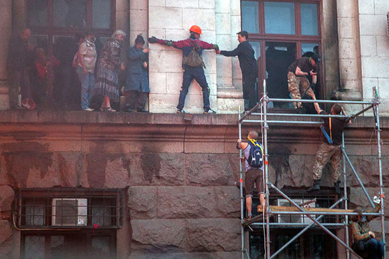 С этого момента у защитников Дома Профсоюзов выбор был только один: гореть или выпрыгивать из окон. Несмотря на то, что первый вызов пожарных был в 19:31, машины приехали только через 40 минут. В самые трагические минуты на месте пожарных не было, и спасать людей из здания начали сами евромайдановцы, приставляя к стенам лестницы и строительные конструкции.