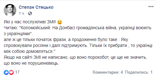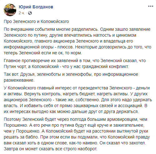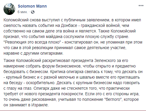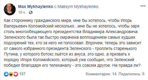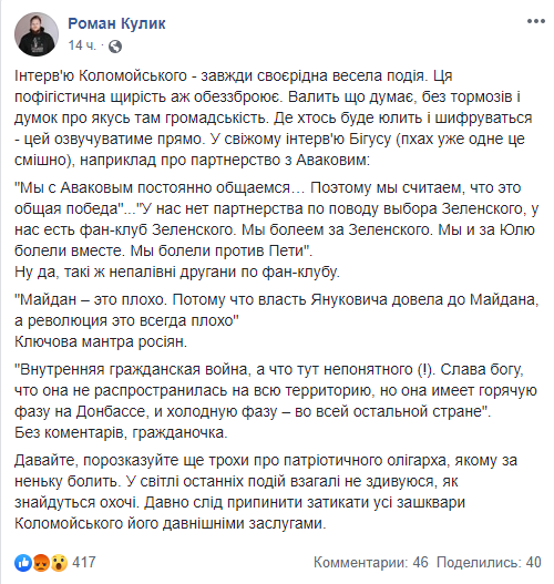 Некоторые отмечают, что интервью Коломойского – это всегда весёлое событие, однако следует прекратить затыкать все зашквары Коломойского его давними заслугами (имеется ввиду, что олигарх, в частности, не допустил захвата власти сепаратистами в родном Днепре, – ред.)