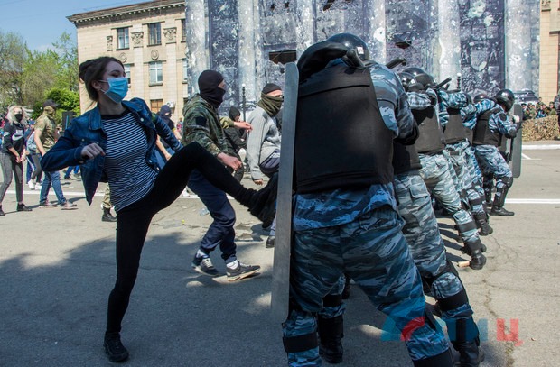 В Луганске здание университета превратили в фальшивый Рейхстаг и имитировали его штурм. А потом на фоне этого Рейхстага имитировали битву "Беркута" с активистами Майдана. Причем больше всего это напоминало не Майдан, а события весны 2014, когда по Луганску эти же самые типочки в масках и бегали, и били сотрудников МВД со щитами.