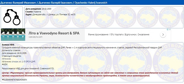 Известно, что боевик входит в базу “Миротворец” и судя по фото, был ликвидирован в 2018 году. Правда о том, что боевик ликвидирован, в базе не сообщается.