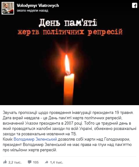 А ранее директор украинского Института национальной памяти Владимир Вятрович сообщал, что из-за Дня памяти жертв политических репрессий страна будет находится в трауре и потому инаугурация будет невозможной.