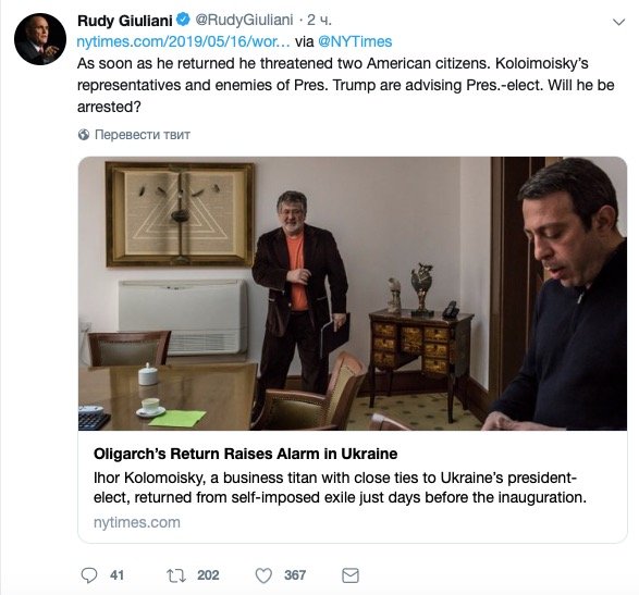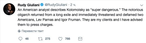 Такая реакция Джулиани последовала после комментария Коломойского украинскому журналисту Михаилу Ткачу, когда тот прибыл в Киев.