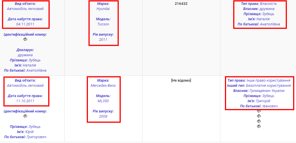 У 2018 році Юрій Зубець задекларував автомобіль дружини Hyundai Tucson 2011 року випуску за 216 432 грн та батьковий Mercedes-Benz ML 350, який не вносився у паперові декларації.