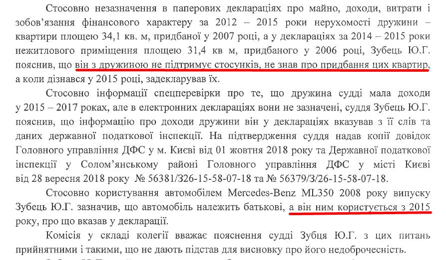 Незважаючи на усі ці недоліки у деклараціях та сумнівність набуття майна, Юрій Зубець успішно пройшов співбесіду у Колегії ВККС у складі В. Устименко (головуюча), П. Луцюка та С. Гладія. Вони відкинули негативний висновок ГРД з просто знущальними аргументами. З’ясувалося, що суддя не декларував майно дружини, бо не підтримує з нею стосунків та не знав про придбання нею цих квартир. А стосовно користування батьковим Мерседесом, то в Рішенні ВККС вказано, що він ним користується з 2015 року, що прямо суперечить деклараціям судді за 2015, 2016, 2017 та 2018 роки, де сам Зубець вказав, що право користування виникло у нього з 11.10.2011.