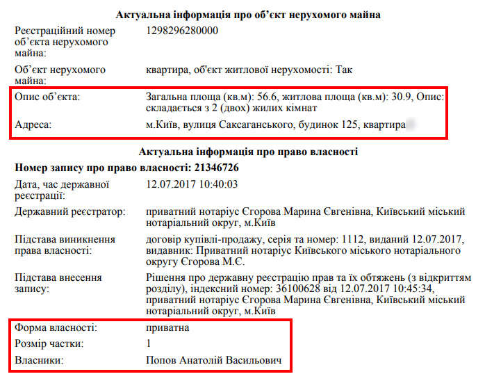 ГРД з посиланням на суддівське досьє зазначає, що за останні 5 років дохід тестя склав 8 049 грн, а дохід тещі Надії Попової ще менше – 1 248 грн. У мережі є оголошення про продаж цієї квартири. Вона реалізовувалась під офіс за 100 000 USD (2 678 000 грн). Виникає логічне питання, звідки кошти на коштовну київську нерухомість? Вірогідно, йдеться про матеріальні цінності, набуті сумнівним шляхом.