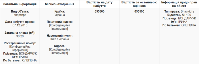 Другою зміною Бондарчук задекларувала придбання квартири у столиці площею 25 квадратних метрів і вартістю 77 мільйонів 142 тисячі 500 гривень.
