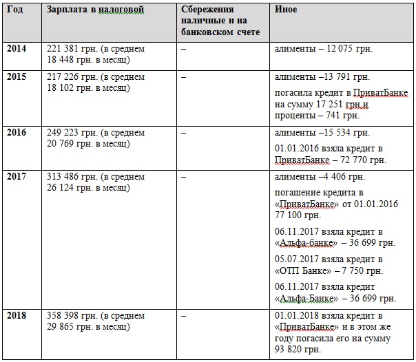 Ирина Косач – судья Новозаводского районного суда г. Чернигова. По сравнению с предыдущими персонажами по декларациям Ирина Анатольевна предстает бедной, несчастной женщиной, вынужденной после развода самой воспитывать младшего сына, довольствуясь алиментами и постоянно увязать в банковских кредитах.