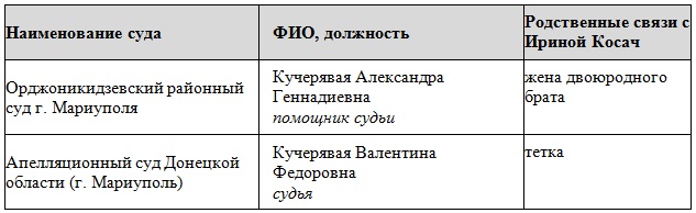 Но если проанализировать специализированные ресурсы о судьях Украины, то оказывается, что у Ирины Косач в Черниговской области родней «схвачена» вся основная судебная цепь – следствие, адвокация, суд, апелляция: