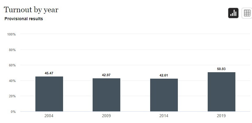 Стоит напомнить, что после первых выборов в Европарламент в 1979 году явка постоянно падала. На последнем голосовании в 2014 году она составляла всего 42,61%.