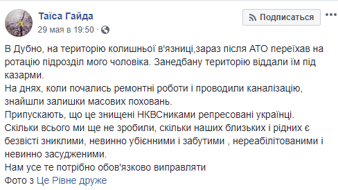 "В Дубно, на территорию бывшей тюрьмы, сейчас после АТО переехал на ротацию подразделение моего мужа. Запущенную территорию отдали им под казармы. На днях, когда начались ремонтные работы и проводили канализацию, нашли остатки массовых захоронений", - написала в Facebook пользователь Таисия Гайда.