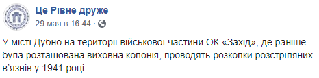 "В городе Дубно на территории военной части ОК "Запад", где ранее была расположена воспитательная колония, проводят раскопки расстрелянных заключенных в 1941 году", - говорится в сообщении.