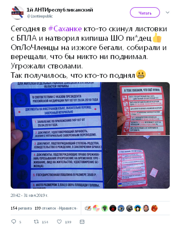 На оккупированной боевиками территории Донецкой области неизвестные патриоты Украины устроили идеологическую диверсию, сбросив массу «образовательных» листовок, посвященных обещанной Путиным раздаче паспортов РФ жителям Донбасса.