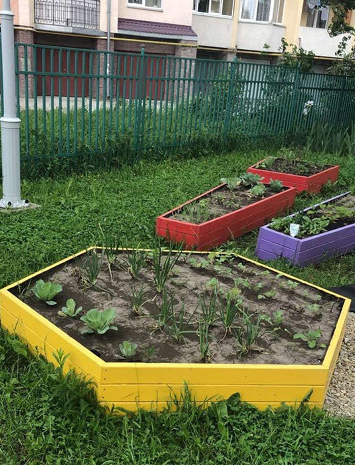 Грядки, на которых дети вместе с воспитателями высадили зелень и капусту, «украшены» деревянными бортиками. При этом грядки имеют четкую геометрическую форму, напоминающую… гробы.