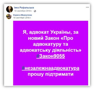 Она «топила» за почивший уже 9055, как за цитируем демократический и взвешенный законопроект, который будет способствовать развитию адвокатуры как правового института. И да, преподнося кусок экскрементов в красивой обертке с бантиком, ей таки удалось перетянуть в свою команду сторонников определенную часть адвокатов. Хотя подавляющая часть адвокатского сообщества жестко раскритиковала проект закона.