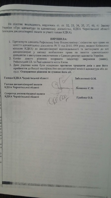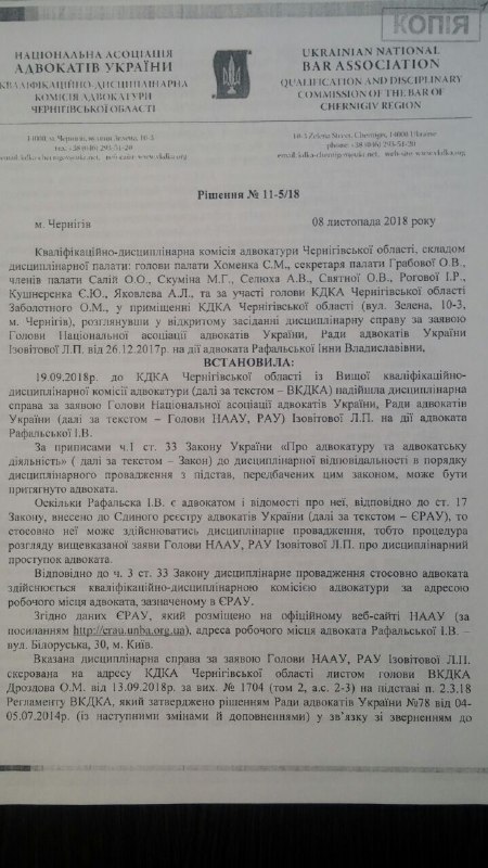 Собственно, именно за это ее и лишили статуса адвоката окончательно (Решение дисциплинарной палаты КДК адвокатуры Черниговской области от 8 ноября 2018 года). В целом, Дисциплинарная палата трижды до этого приостанавливала ей право заниматься адвокатской деятельностью. Сведения об этом внесены в ЕРАУ. Но Рафальская продолжает работать, ее реальность ведь – параллельная.