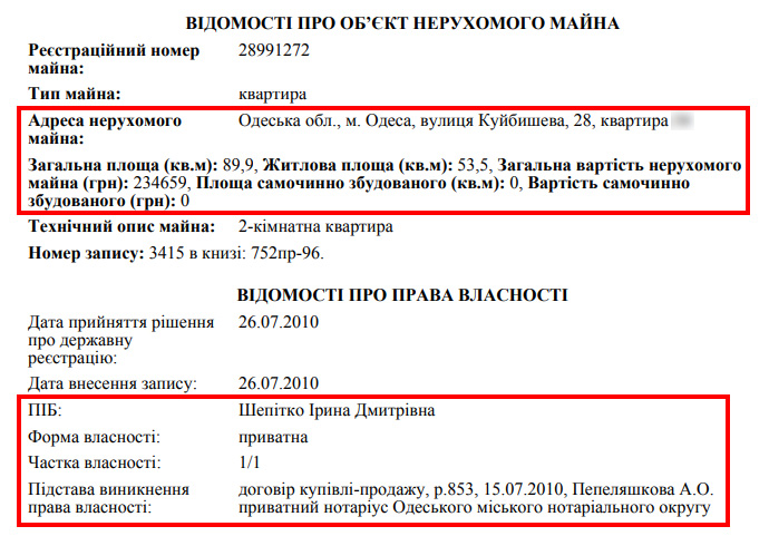 Якщо вірити декларації, суддя Шепітко прописаний та проживає в одеській квартирі площею 89,9 кв. м, яку купила дружина у 2010 році за 235 000 грн.