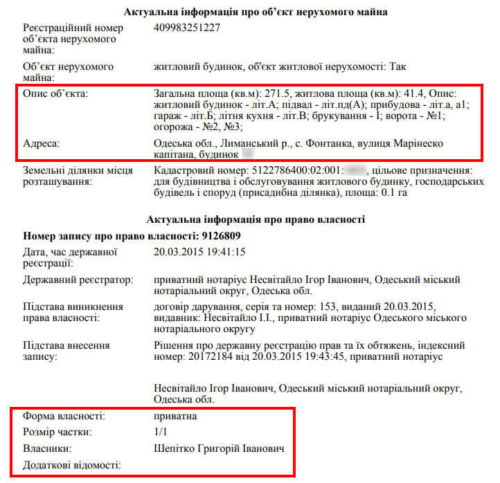 У мережі є оголошення з продажу будинків у селі Фонтанка, де просять 758 дол. США за кв. м площі. Отже, ціна такого маєтку може дотягувати до 200 тис. дол. США. Хто ж подарував сину судді коштовну нерухомість? Звісно, що батько-суддя. І відбулось це через 2 дні після викриття факту надання хабаря судді Григорію Шепітку – 20 березня 2015 року. Очевидно, таким чином майно судді захищалось від можливої конфіскації.