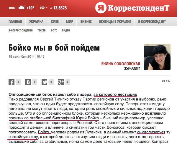 Не чураются блогеры «Корреспондента» и кондового выборного пиара. Отдельного внимания заслуживает прямоугольный как комод пост журналиста Янины Соколовской, воспевающей ни разу не запятнанную нефтяными вышками репутацию лидера «Оппозиционного блока» Юрия Бойко. Кстати, за заголовок «Бойко мы в бой пойдем» лично я номинировал бы Янину на Пулитцера - это гениально.