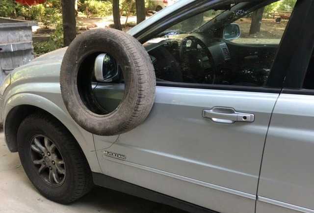 Так, на фото, опубликованном сообществом можно заметить, как на боковом зеркале неправильно припаркованного на тротуаре у мусорного бака транспорта – элитного семейного хетчбэка иностранного производства, висит автомобильная шина.