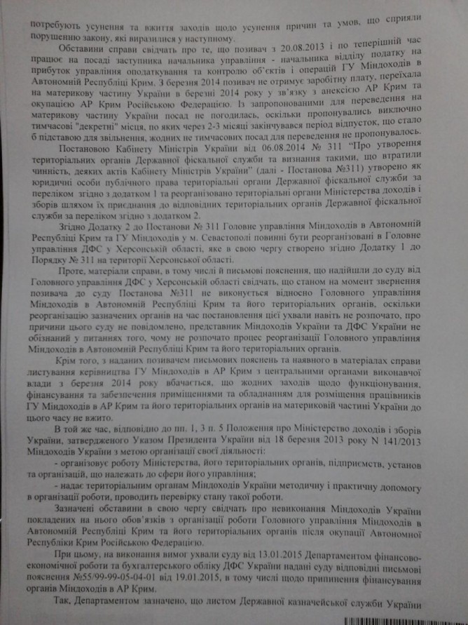— невыполнение Миндоходов Украины возложенных на него обязательств в части организации работы ГУ Миндоходов в АРК и его территориальных органов после оккупации Крыма Российской Федерацией;