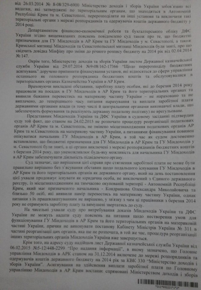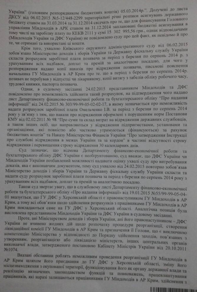Теперь самое интересное. По требованию суда от 13.01.2015 г. Департамент финансово-экономической работы и бухгалтерского учета ГФСУ предоставил письменные пояснения № 55/99-99-05-04-01 на тему причин прекращения финансирования крымских подразделений ведомства. Департамент отметил, что 26 марта 2014 года, Государственная казначейская служба Украины обязала Миндоходов перераспределить все расходы, предусмотренные крымчанам на другие подразделения, а крымские главки исключить из сети распорядителей и получателей бюджетных средств.
