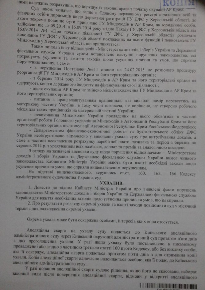 Суд выяснил, что постановление Кабмина № 311 игнорируется по сей день. Реорганизация ГУ Миндоходов в АР Крым и г. Севастополе даже не начата. Никаких мер относительно функционирования, финансирования, обеспечения помещениями и оборудованием для размещения крымских налоговиков на материковой части Украины не предпринято. Объяснить причины бездействия ответчик в лице представителя ГФСУ не смог, сославшись на свою неосведомленность в этих вопросах.