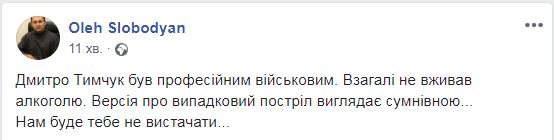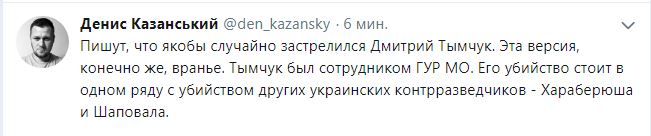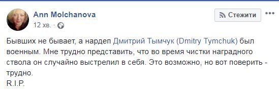 При этом многие считают, что вряд ли версия о том, что Тымчук «случайно застрелился при чистке наградного оружия», является правдивой.