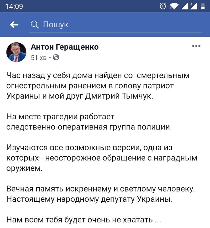 Народный депутат Украины Антон Геращенко, который первым сообщил о гибели Тымчука и сообщил, что тот погиб во время чистки наградного оружия, позже немного изменил информацию о ЧП.