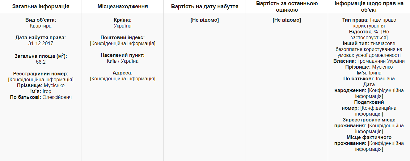 Також у декларації зазначено, що людина з ім’ям, аналогічним дарувальнику (Мусієнко Ірина Іванівна), є власником квартири, якою безоплатно користується інспектор митниці.