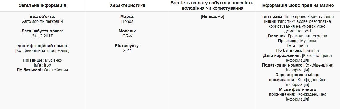 Крім того, у декларації зазначено автомобіль, яким інспектор також користується безоплатно. Вже здогадуєтесь, хто його власник? Так, Мусієнко Ірина Іванівна.