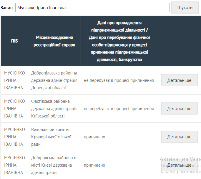 У Єдиному державному реєстрі юридичних осіб, фізичних осіб-підприємців та громадських формувань людини на ім’я Мусієнко Ірина Іванівна, яка б вела бізнес у Києві, немає.