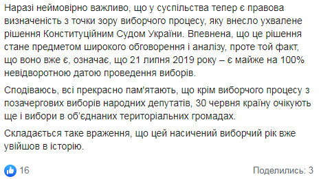 Об этом сообщила глава ЦИК Татьяна Слипачук на своей странице в Facebook.
